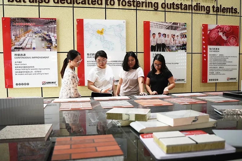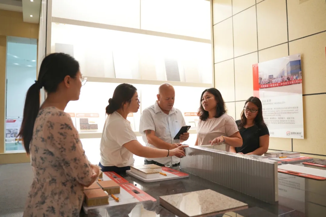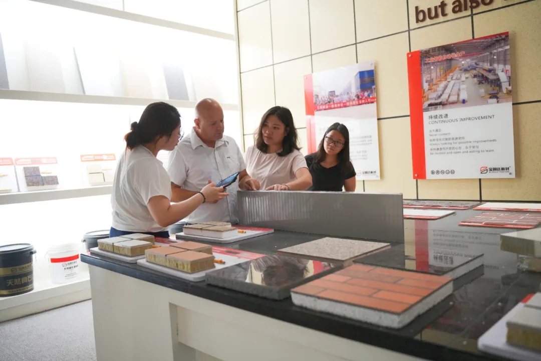 寶潤達外貿(mào)部朱經(jīng)理等人進行了熱情接待,并帶領(lǐng)Webb先生一行參觀了寶潤達聚氨酯復合板、外墻保溫裝飾一體板、冷庫板等產(chǎn)品,隨后詳細解答了Webb先生在安裝過程中遇到的問題,闡述了專業(yè)的技術(shù)經(jīng)驗,并提供了切實有效的解決方案。